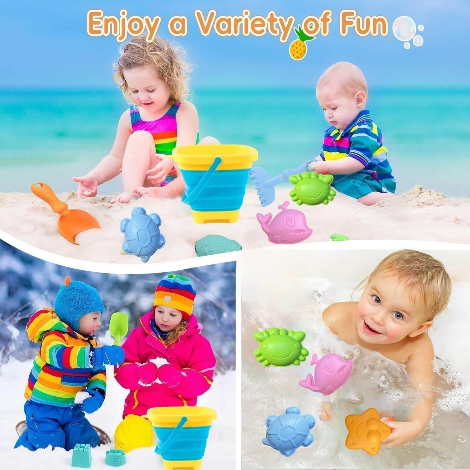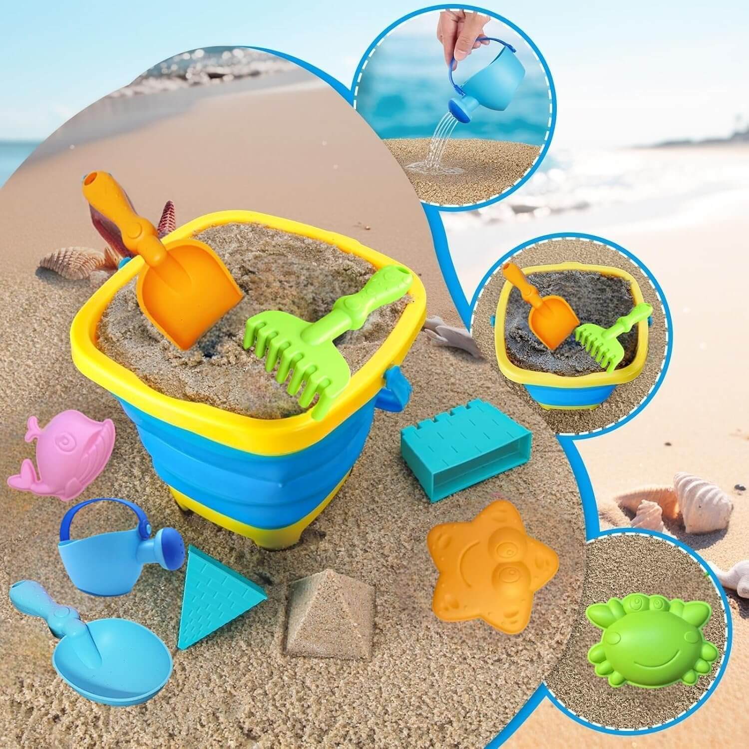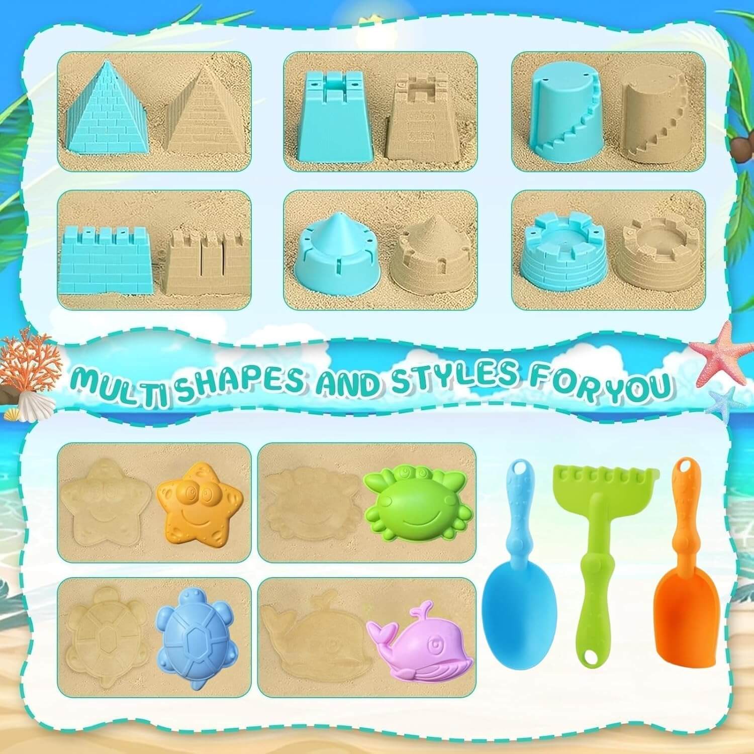 - Spraw, aby Twoje dzieci były gotowe na niekończącą się zabawę na plaży dzięki naszemu super wartościowemu zestawowi zabawek do piasku! Nasza zabawka plażowa jest dostarczana z praktyczną torbą plażową z siateczki, składanym wiadrem plażowym, 2 łopatkami i grabą, 6 szalunków zamkowych, 4 formy plażowe w kształcie rozgwiazdy, żółwi, wielorybów i krabów do kreatywnej zabawy oraz konewka