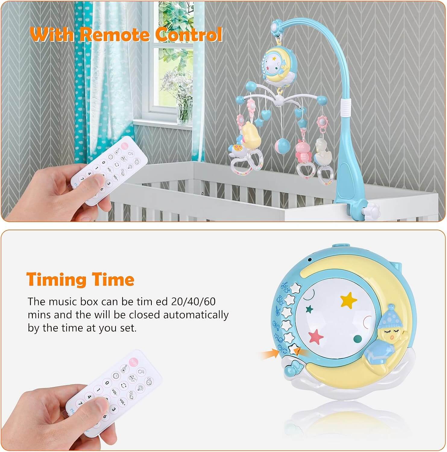 Ta karuzela do łóżeczka z pilotem gwarantuje maksymalny komfort użytkowania. Możesz włączyć, wyłączyć lub zmienić funkcje za pomocą pilota, nie budząc śpiącego dziecka.