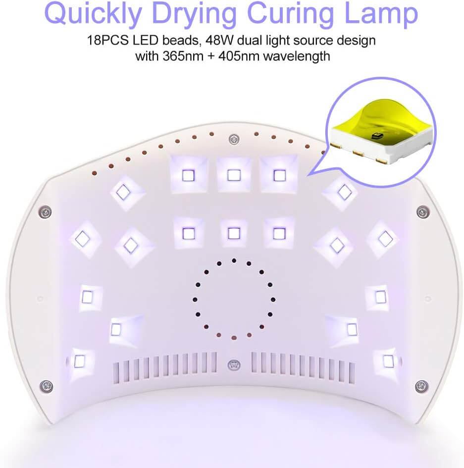 • Moc 48W i Nowa Technologia Dual-Wave: Wyposażona w 24 diody LED o podwójnej długości fali (365 nm + 400 nm), co gwarantuje utwardzanie wszystkich rodzajów żeli UV i LED dostępnych na rynku.