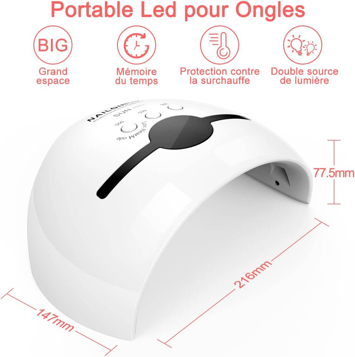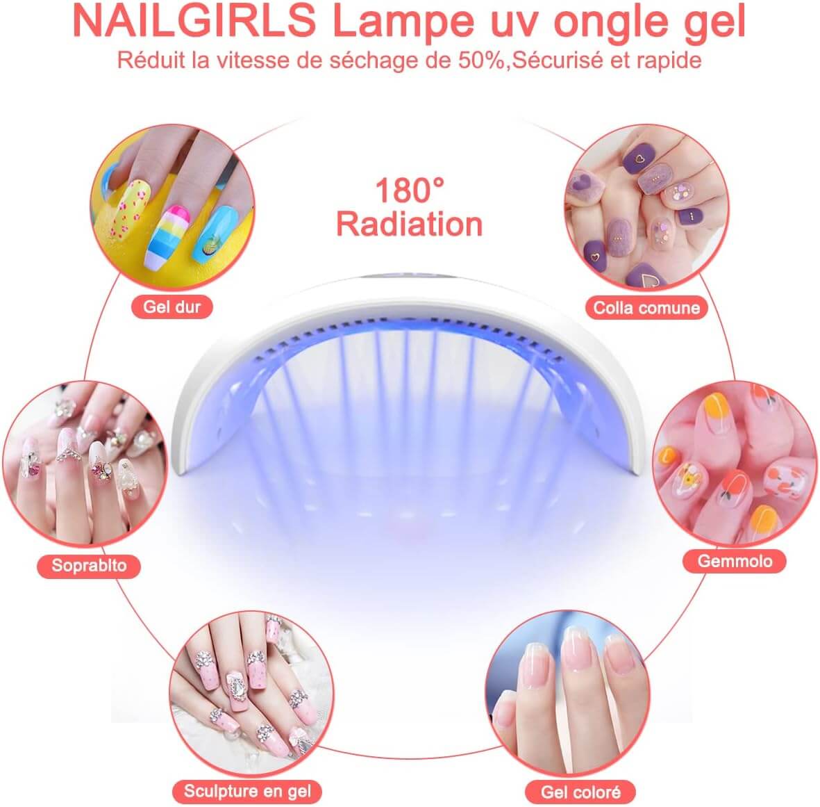 • Konstrukcja 180° Bez Martwego Pola: Specjalnie zaprojektowane, równomiernie rozmieszczone koraliki LED zapewniają pełne pokrycie i jednolite utwardzanie 5 paznokci u dłoni lub stóp jednocześnie, bez ryzyka niedoschnięcia.