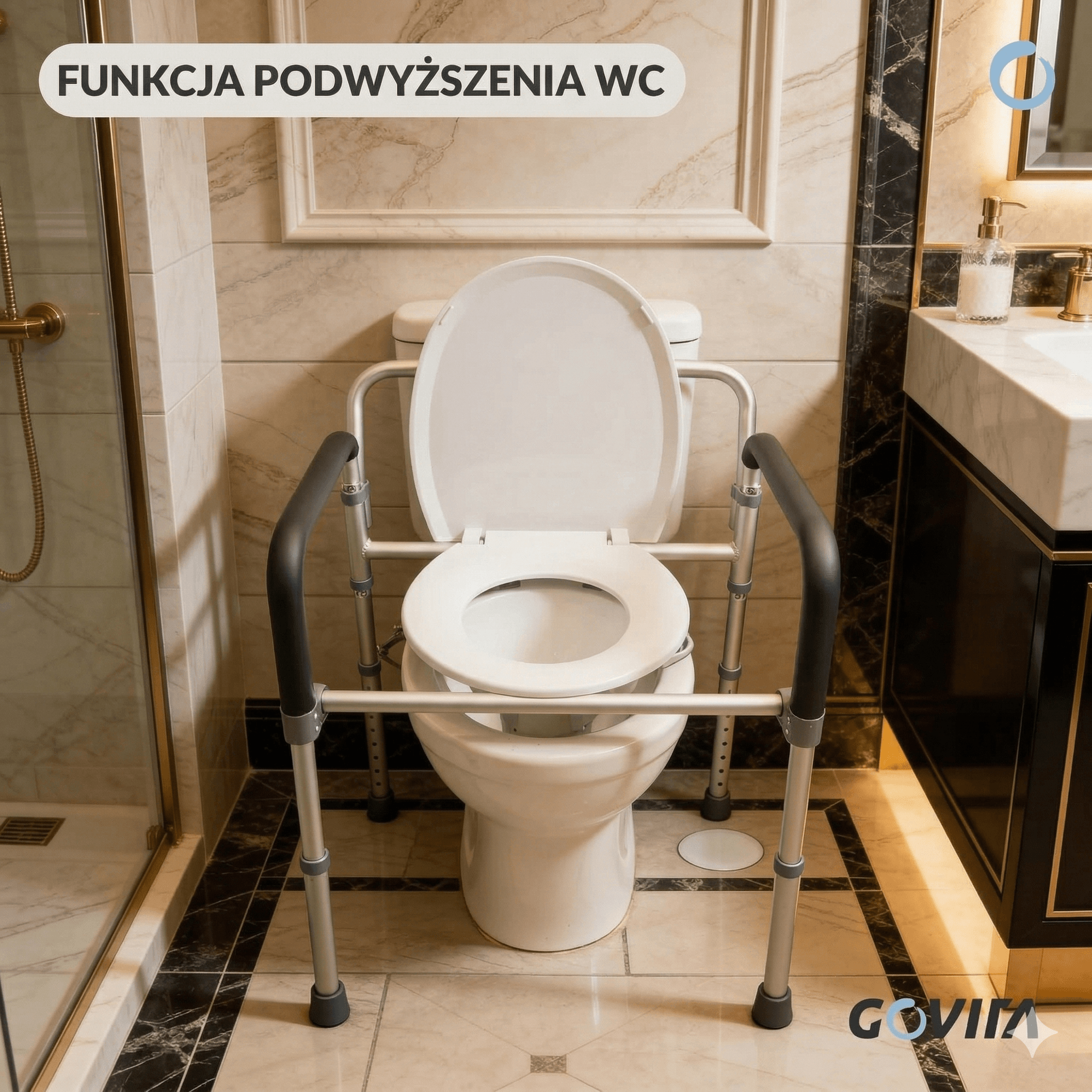 Podpórka asekuracyjna do toalety: Stanowi stabilne oparcie i stelaż wspomagający podczas korzystania z łazienki.