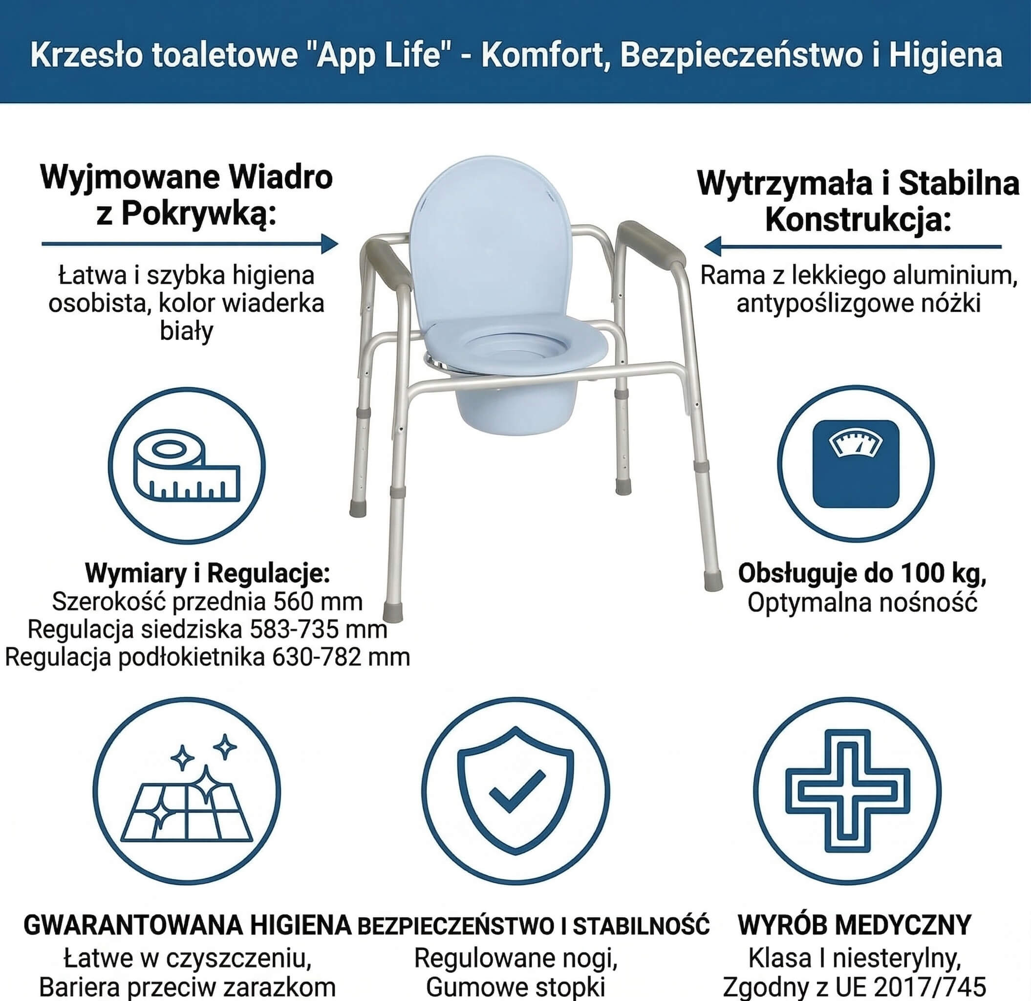 Pełna higiena i wygoda: Krzesło wyposażone jest w wyjmowane, plastikowe wiaderko z pokrywą. System łatwego wysuwania znacząco przyspiesza i ułatwia opróżnianie oraz utrzymanie czystości.