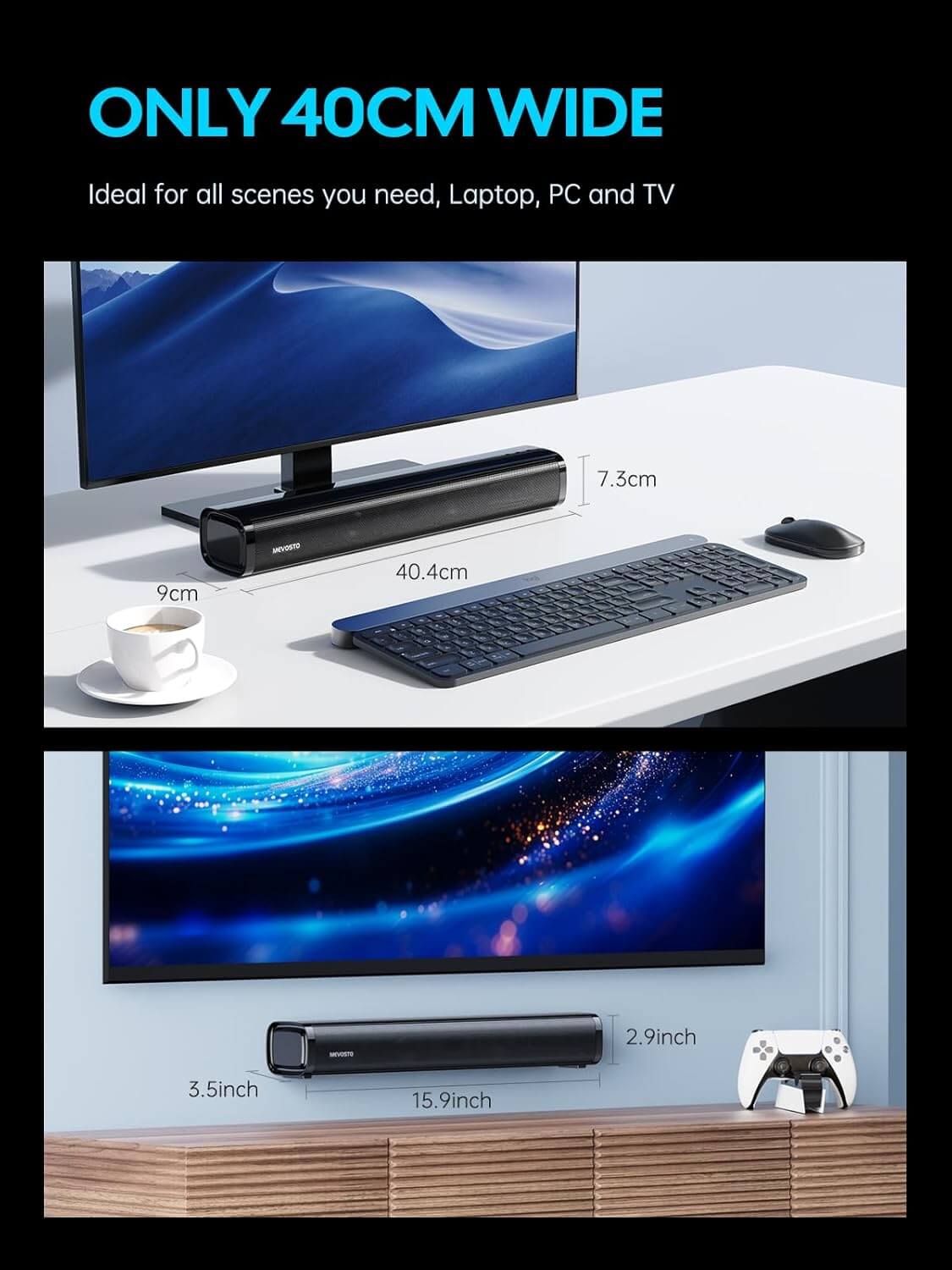 - Kompaktowy design, potężny efekt: Mierząc zaledwie 7,3 cm wysokości i 40,5 cm długości, MEVOSTO MINI D7-3 elegancko wkomponuje się w każde biurko czy szafkę pod telewizor, nie zajmując cennej przestrzeni.
