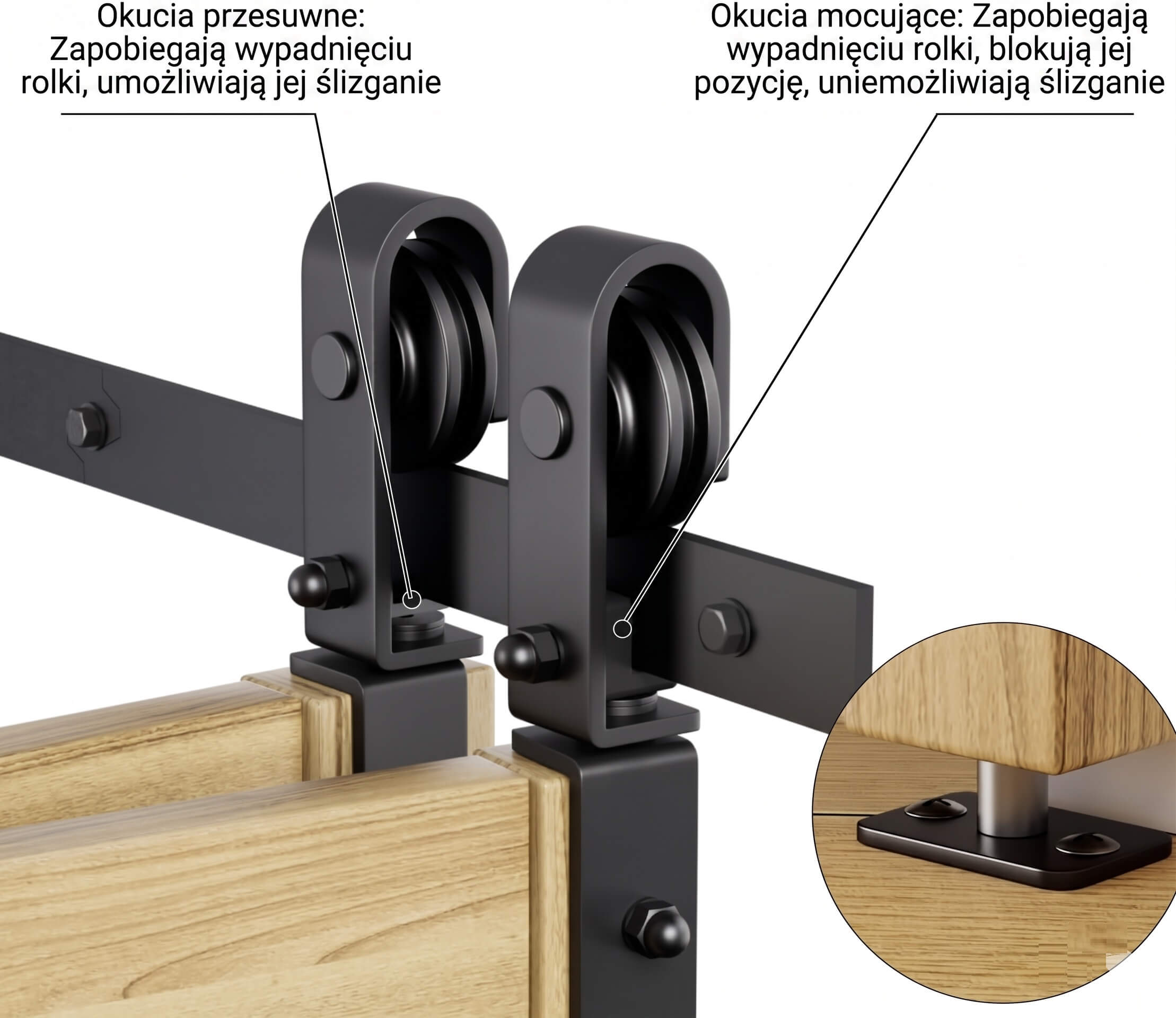 Bardzo cicha praca: Zależy Ci na ciszy w domu? Nylonowe rolki jezdne sprawiają, że przesuw jest niezwykle płynny i bezszelestny. Dodatkowo, wbudowany sprężynowy stoper łagodnie amortyzuje drzwi przy zamykaniu, eliminując uciążliwe trzaskanie.